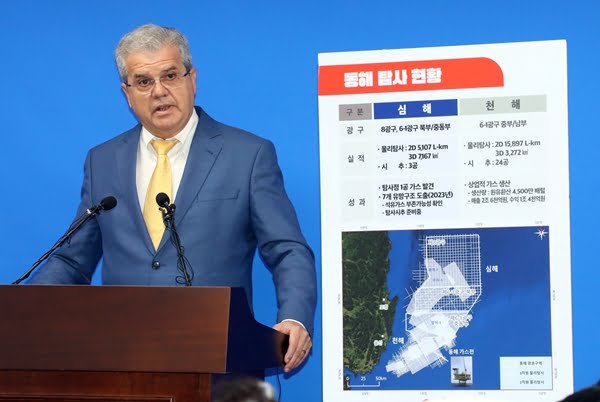 (Sejong = Yonhap News) Vitor Abreu, an advisor to Act-Geo in the United States, who was in charge of analyzing deep-sea oil and gas deposits in the East Sea, held a briefing at the Sejong Government Office on the 7th and explained various questions, and it is interesting to see if the controversy surrounding the announcement will be resolved.