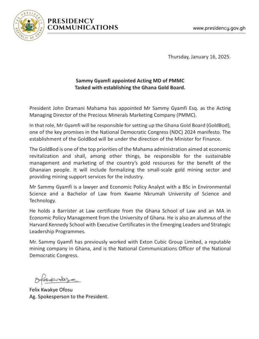 President John Dramani Mahama has appointed Sammy Gyamfi as the acting Managing Director of the Precious Minerals Marketing Company (PMMC).