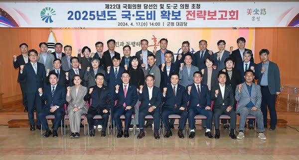 A meeting on plans to secure the 2025 government budget and pending projects held at the county office auditorium at 2 p.m. on the 17th was held with about 50 people in attendance, including Mayor Lee Yong-rok of Hongseong County, National Assembly member-elect Kang Seung-gyu, County Chairman Lee Seon-gyun, county lawmakers, and senior government officials.